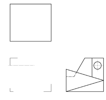 【已刪除】二、請依下列正投影視圖所示視圖方向,使用三角板以比例 1:1 繪製等角圖(等角圖尺 度誤差值超過正負 2 mm 處不計分),等角圖之視角必須能顯示前視圖、俯視圖、右 側視圖(不用標註尺度)。(25 分)
