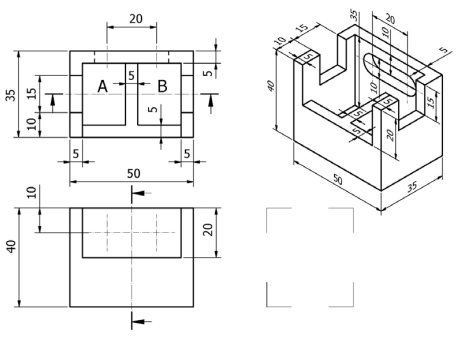 【已刪除】三、請依下列正投影所示之尺度,以比例 1:1 繪製正投影視圖,不用標註尺度。視圖包 含前視圖、右側視圖及俯視圖,視圖中 A、B 兩處之厚度相同(前視圖、右側視圖 須依割面線繪製剖視圖)。(25 分)