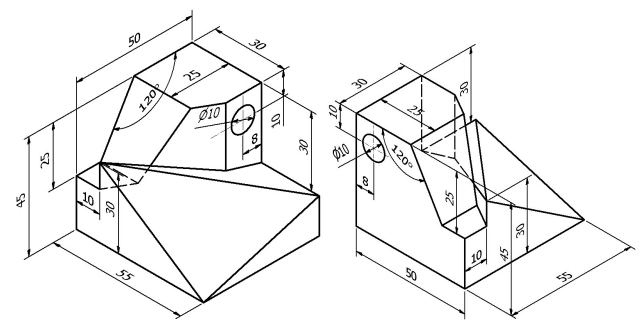 【已刪除】一、請依下列兩個立體圖所示之尺度,以比例 1:1 繪製正投影視圖,視圖包含前視圖、 俯視圖及右側視圖三個正投影視圖(如圖所示)(不須標註尺度)。(25 分)