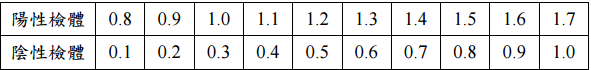 【已刪除】三、利用 ELISA 測量 10 個 B 型肝炎病毒表面抗原抗體(anti-HBsAg antibody)陽性檢體 及 10 個陰性檢體 OD 讀值結果如下表。請利用 OD = 0.05、0.5、0.9、1.2 及 1.8 共 5 個 判定值(cutoff point)畫出 ROC 曲線(Receiver operating characteristic curve),並說 明那個 OD 值為最佳判定值?(30 分)