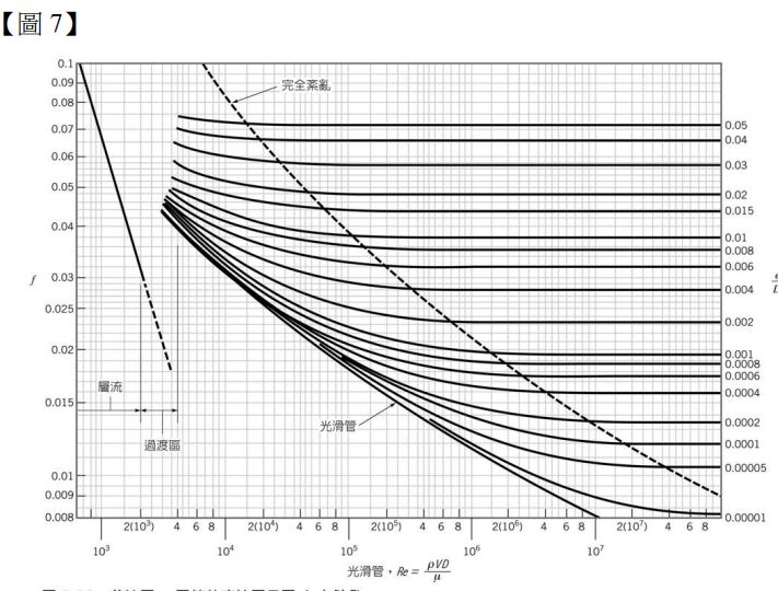 7.如【圖 7】所示之慕迪圖、圓管的摩擦因子圖,慕迪圖(Moody chart)在層流區,有關摩擦係數(f)的說明,下列敘述何者正確? (A)與雷諾數(Reynolds number)成正比 (B)與溫度平方成正比 (C)與相對粗糙度無關 (D)與溫度平方成反比