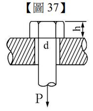 37.如【圖 37】所示之鋼製螺栓受負荷 P= 2600 N,螺栓直徑 d= 2 cm,容許剪應力為 6 MPa,若忽略彎矩效應,請問螺栓頭的高度 h 為何? (A) 5 mm (B) 6 mm (C) 7 mm (D) 8 mm