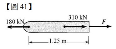 41.如【圖 41】的剛體受力情況,當力平衡時,請問 F 力為若干?(A) 490 kN 向左 (B) 490 kN 向右 (C) 130 kN 向左 (D) 130 kN 向右