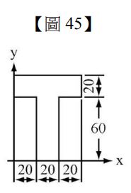 45.【圖 45】為一個 T 形的截面,長度單位是公分,請問形心的座標位置(x, y)為何?(A) (30, 50) (B) (30, 40)(C) (38, 40) (D) (38, 50)