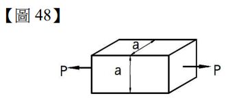 48.如【圖 48】的正方形截面金屬桿,承受拉力 P 為 3200 N,最大拉伸應力為 100 MPa,請問邊長 a 至少為若干 mm? (A) 2 (B) 4 (C) (D) 8