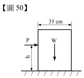 50.如【圖 50】所示,有物體重 W,寬度為 35 cm,物體與接觸面間的靜摩擦係數為 0.35,受一水平力 P 作用,當該物體恰能滑動而不傾倒時,請問 P 力作用的最高位置 h 為若干?