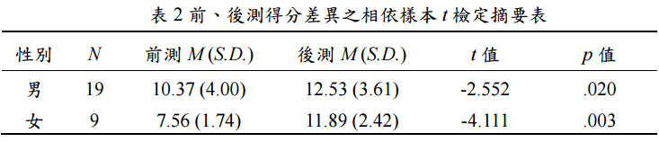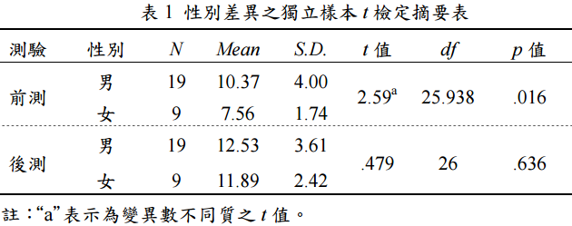 【已刪除】三、有國小學童 4~6 年級男學生 19 人和女學生 9 人,參加某一實驗課程,課程進行前 實施前測,課程完成後以同一測驗進行後測,測驗成績進行獨立樣本 t 檢定,統計結 果如表 1 所示,請說明檢定結果與結論。 (15 分)