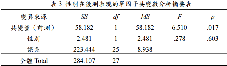 五、承第三題,前述的測驗成績再進行單因子共變數分析(前測分數為共變項、後測分 數為依變項) ,統計結果如表 3 所示,請說明檢定結果與結論。(15 分)