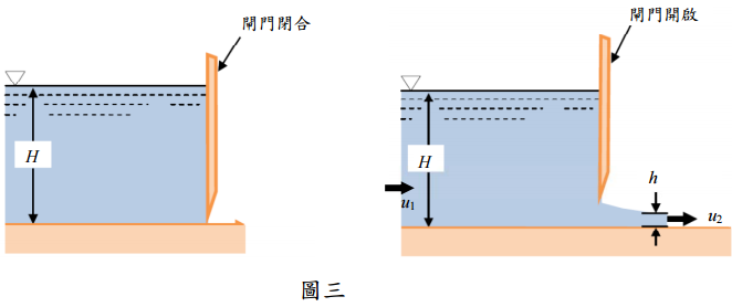 【已刪除】三、HVR 水閘狀態如圖三所示。已知閘門寬度為 b,請問,閘門閉合時與閘門稍微開啟 時(即 H >>h),兩者用來抗拒水壓以固定閘門之錨固拉力(anchoring force)分別為 何?其差值為何?(假設水的密度為 ρ,重力加速度為 g,閘門開啟時水流動承受底 部阻力為 F