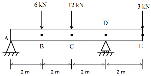 【已刪除】三、一根簡支撐樑承受三個集中負載如圖所示。試繪製沿著此樑長度方向之剪力分布圖 與彎矩分布圖。(25 分)