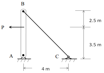 【已刪除】四、一根鋼樑承受負載 P 如圖所示,此處鋼繩 BC 的直徑為 4 mm,楊氏係數 E 為 200 GPa。 已知此鋼繩 BC 之最大應力不超過 190 MPa,並且伸長量不得超過 6 mm。基於此限 制,試問 P 的最大容許值為多少?(25 分)