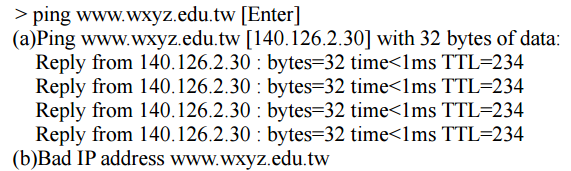【已刪除】⑴ping 指令是用來診斷網路連線狀態與連線品質,若網路品質監測公用程式 ping 指 令之執行如下(a)及(b)所示兩種結果,請問其所呈現的意義為何?試詳細說明之。