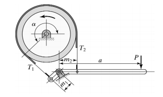 【已刪除】四、如下圖所示煞車系統,試推導出分析此系統之力的方程式,並導出能產生煞車扭力 的公式。此系統在 m1是多少時,可以最小 P 得到最大煞車力?(20 分)