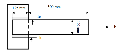 =8 mm,F=1,000 kg,焊條 之保證強度(proof strength)為 190 MPa,板子之材料強度為 250 MPa。力量 F 應該 置於何處才不會對接頭有彎矩的影響?(5 分)請算此焊接接頭之安全係數。(15 分)
