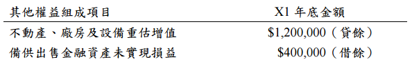 【已刪除】二、甲公司成立於 X1 年初,X1 年以$6,000,000 購入土地,分類為不動產、廠房及設備,採重 估價模式衡量。同年度以$2,000,000 購入股票投資,分類為備供出售金融資產。 甲公司 X1 年底與該土地及股票相關之其他權益組成項目資料如下: