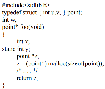 【已刪除】三、根據變數的生命週期(lifetime),請針對下列 C 程式中的 5 個物件包括變數 w,x,y,z 與指 標 z 所指結構物件,分別說明它們是使用何種記憶體配置(allocation)方式。(25 分)
