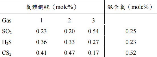 【已刪除】六、如下表所示,從 3 個已知成分的氣體鋼瓶,要摻配製成混合氣 2.5 莫耳的成分。請評 估計算是否可從 3 個鋼瓶的氣體摻配而得?如果可以 需從 3 個鋼瓶各取多少莫耳? (15 分)