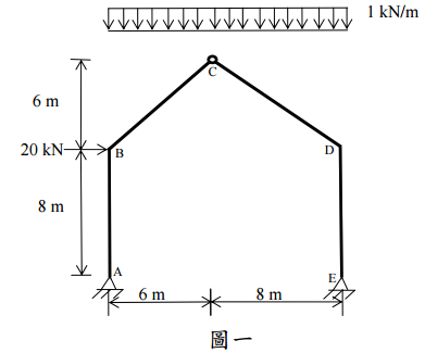 【已刪除】一、如圖一所示靜定剛架結構各桿件之 E、I 均相同。剛架結構 A、E 點為鉸支承,C 點 為鉸接。在 B 點施加水平載重 20 kN,桿件 BC、CD 並承受垂直均佈載重 1 kN/m。 請計算 A、E 點支承反力為何?並繪桿件 AB、BC 之剪力圖與彎矩圖。(25 分)