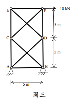 【已刪除】三、如圖三所示桁架結構各桿件之 E、A 均相同。在 F 點承受 10 kN 水平力。請取 ED 桿 件力為贅力,以應用力法(諧合變位法)推導 ED 桿件力,並求得各桿件之桿件力為 何?(25 分)