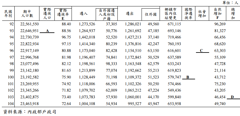 【已刪除】四、影響一個國家的人口不外乎出生、死亡及遷徙。下表為民國 92 年至 104 年我國人口 社會增加概況。請回答表中 A、B、C、D 等四個欄位的數據及 E 和 F 等兩個欄位的 計算公式。(18 分)我國的國際淨遷入自民國 93 年由負轉正,在 97 及 98 年高點後 又逐年減少。戶政人員必須充分掌握人口遷徙的動態,試以當時的社會事件或法規 修訂等歷史進程解釋上述國際淨遷入之變化。(7 分) 我國人口社會增加概況