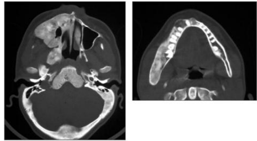 72. 下圖X光片中,右下第三大臼齒處和下顎上升枝所呈現之骨破壞,下列何種診斷最有可能?
