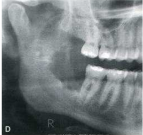 70.一位18歲男性患者主訴右下顎後牙痛及下顎骨慢慢膨大,下圖X光片顯示右下顎第一大臼齒 根尖處有一混合放射阻性及放射透性之病灶、外圍一明顯的放射透性帶,並有根部吸收情 形,根據上述資料其臨床診斷最不可能為下列何者?