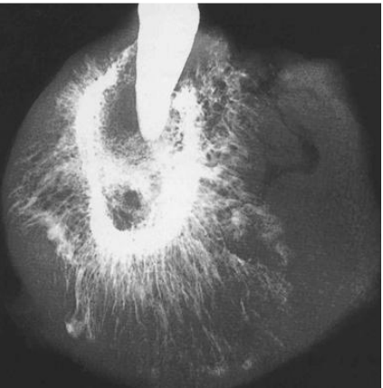 (A)洋蔥皮狀影像(onion-skin appearance) (B)毛玻璃狀影像(ground-glass appearance) (C)羊毛棉花狀影像(cotton-wool appearance) (D)陽光線狀影像(sun-ray appearance)