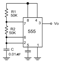 124. 下圖 IC 555 組成的方波振盪電路,其輸出信號的工作週期為下列何者?