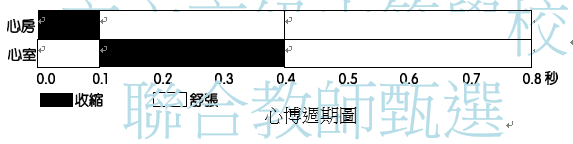( )12.下圖為某人一次的心搏週期,下列相關敘述何者正確? (A)0.1~0.4 秒的階段可觀察到房室瓣關閉 (B)一次心搏週期的過程中,每一心室將收縮一次、舒張兩次 (C)此人的心臟一分鐘跳動 65 次(D)心房先收縮,心室再接著收縮 (E)0.0~0.1 秒,血液會從心房進入心室。