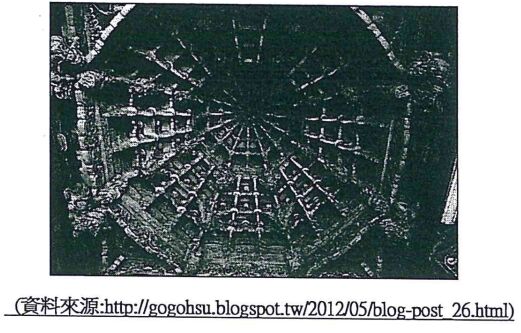 13. 如下照片所示,為臺灣傳統廟宇建築中常見於主殿室內天花下的木結構斗栱組合,以不斷向中心出挑的斗栱,交織成網狀又稱「蜘蛛結網」或「結網」,其形式有八角形、四方形及圓形等極具裝飾性統稱為「藻井」。