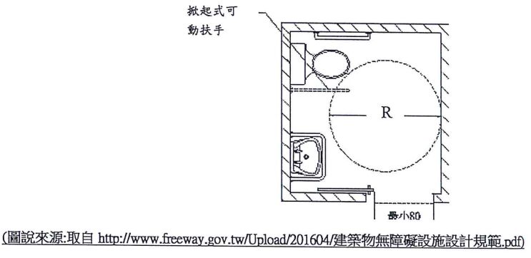 22. 如下圖示,依據建築物無障礙設施設計規範,該法所稱淨空間係指廁所盥洗室空間內應設置迴轉空間,其直徑(R)不得小於 150 公分。