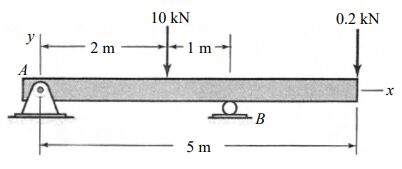 六、如圖表示一個等截面的橫樑(prismatic beam)及其受力狀態,A 為銷接(pin)支持, B 為滾柱(roller)支持。求解 A 與 B 處的反作用力,並繪製剪力圖(shear diagram)。 (20 分)