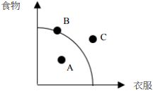 1 某國的生產可能線如圖所示,試問下列敘述何者錯誤?(A)失業將造成生產組合點移至 A 點(B)當社會處於 B 點時,資源適合生產食物(C)若生產可能線外移到 C 點時,表示財貨的品質提昇(D)社會無法達到 C 點,是因為資源的稀少性