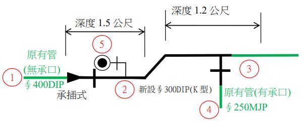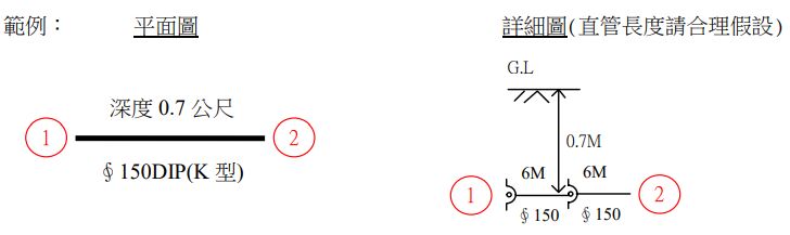 第一題:請依「臺北自來水事業處管線工程竣工圖繪製作業須知」之圖例及相關規定,繪製自來水管線(由一節點編號至另一節點編號)之詳細圖(含節點處之直管、管件、管徑、深度、固定台、立面、半立面等):請繪製如下平面圖之管件詳細圖,直管長度請合理假設,每繪製錯誤或漏繪 1 處(包括直管、管件、管徑、深度、固定台、立面、半立面及應備註文字,每項均以 1 處計)扣 0.5 分,扣至 0 分為止。【30 分】