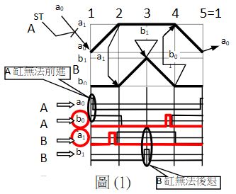 7. 下圖(1)為直覺法設計氣壓迴路繪圖過程,其中A缸在步驟1及B缸在步驟3會遇到無法動作問題。可以單向輥輪作動閥把無法動作問題快速解決掉。但也會帶來必須把氣壓缸凸塊(dog)碰觸長度加長的問題。