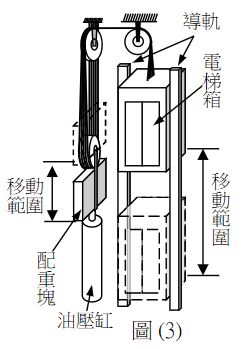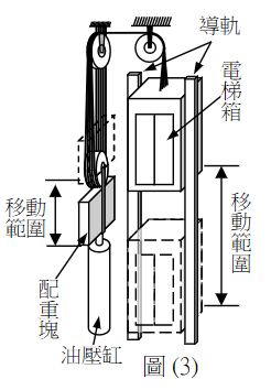 6. 下圖(3)為高鐵車站某一部乘客使用之油壓電梯的機械結構圖,其電梯箱重量W1=1000 kgf(由配重塊平衡掉)、移動距離S=6 m、移動時間t=9 sec、承載重量W2=1625 kgf;若忽略機械摩擦因素、供給壓油之壓力P=58.5 kgf/cm²、油壓缸之桿徑為缸徑0.4倍、出力取1.8倍安全裕量,試問油壓缸的缸徑為多少mm以上才有足夠之驅動力。
