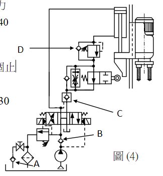 7. 下圖(4)為自動鑽床的油壓迴路圖,在迴路圖中,分別有4個止回閥(A、B、C、D四處),試問C閥件的順向開啟壓力(cracking pressure)約為多少kgf/cm²才能使迴路正常運作又可節省能源消耗。