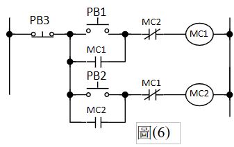 11. 如下圖(6)之繼電器電路,當PB3未押下且MC1與MC2 OFF時,下列敘述哪項正確。