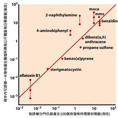 73. 下圖為不同化學物質對實驗動物致癌或對沙門氏菌致突變所需要的劑量關係圖,請問有關此關係圖的敘述何者錯誤?(A)同一物質的致癌性與致突變性呈現負相關 (B)benzidine 的致癌力比 4-aminobiphenyl 低 (C)本圖中致癌力最高的物質為 aflatoxin B1 (D)moca 與 mms 的致癌力相當,但 moca 的致突變力比 mms 高