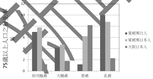 76. 下圖為美國夏威夷地區的日本人/白人,與日本大阪地區日本人,在 70 歲時不同癌症的發生率,請從圖中判斷哪種 癌症的發生原因,人種因素高於生活習慣或環境?(A)前列腺癌 (B)大腸癌 (C)胃癌 (D)乳癌