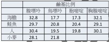 96. 從以下表格推估,小麥中的胸腺嘧啶含量為何較合理?(A)28.5 (B)21.2 (C)18.6 (D)35.9