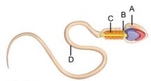 100. 請問粒線體存在於精子(下圖)的何處?(A)A (B)B (C)C (D)D