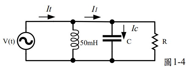 8. 如圖1-4所示的RLC並聯電路,電源電壓v(t) = 100sin(1000t)V,若I₁的電流大小為10A,IC的電流大小為8A,則電路的功率因數為何? (A) 0.5 (B) 0.707 (C) 0.886 (D) 1