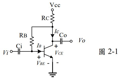 1. 如圖2-1所示電路,電晶體β=99,VBE=0.7V,VCC=10.7V,RB=300K,RC=1K。則VCE=___________。
