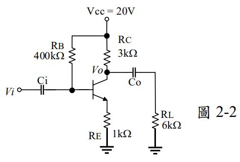 2. 如圖2-2所示電路,若VBE=0.7V,β=50,VT=26mV,則電壓增益VO/Vi=____________。
