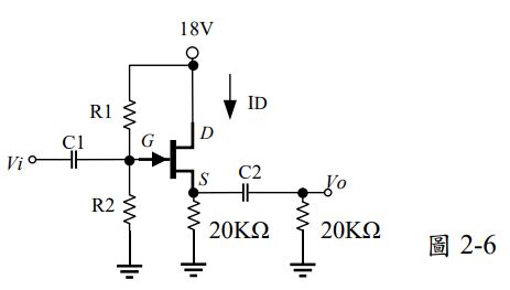 6. 如圖2-6所示之JFET電路,已知VGS=–4V, ID=0.5mA,則R1/R2的值為何?_____________