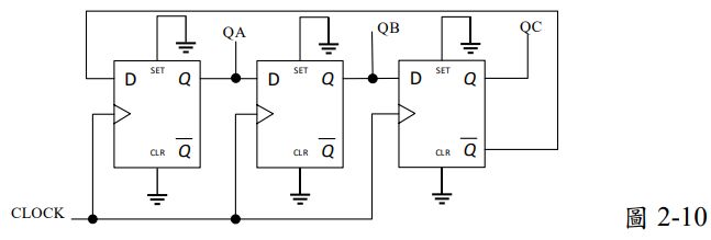 9. 如圖2-9電路圖中,若D2D1D0的初始狀態為000,且CLK適當觸發,電路經過4個時脈週期後,D2D1D0會呈現甚麼狀態?_________