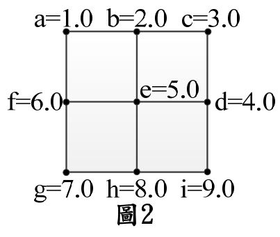 31.對圖2進行面積水準測量,每方格邊長為10m,各點挖 土深度分別為a=1.0m、b=2.0m、c=3.0m、d=4.0m、 e=5.0m、f=6.0m、g=7.0m、h=8.0m、i=9.0m。忽略挖 土造成體積改變,請計算平均總開挖土方體積為多少立方米? (A)1125 (B)1375 (C)2000 (D)5500 m3。