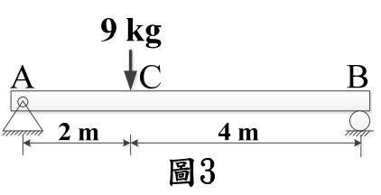 32.簡支梁如圖3所示,受一集中載重9kg向下作用於C點, 請 問 B 點 反 力 為 (A)3kg( 向 上 ) (B)3kg( 向 下 ) (C)6kg(向上) (D)6kg(向下)。