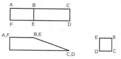 17 如圖為一物體之三視圖,根據第三角投影法,下列敘述何者正確? (A)俯視圖中, 平面 BCDE 為真實大小之平面 (B)前視圖中 BC 線段為實長 (C)俯視圖中 ED 線段為實長 (D)此物體具有複斜面
